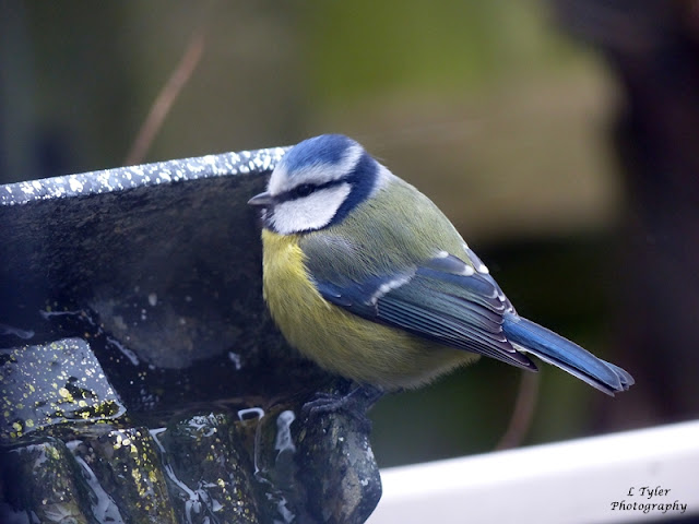 The little Blue Tits were very active the other morning and I caught this one while sitting in the lounge - not the best of pictures as taken through our very dirty patio window.